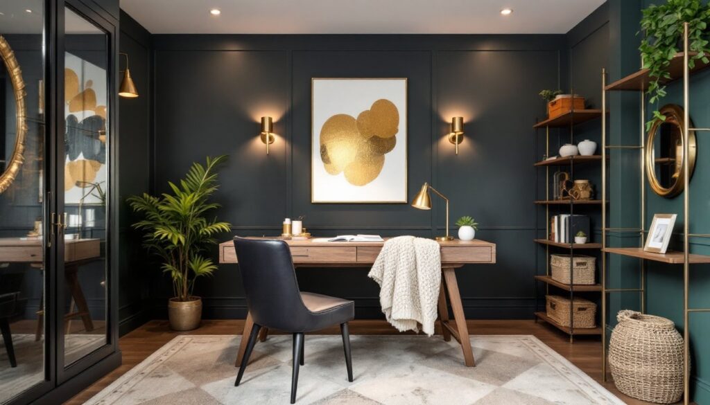 High-contrast design elements are the secret weapon in moody spaces. White trim, light-colored baseboards, or pale wood shelving against dark walls creates visual breathing room. Some homeowners worry this feels too “colonial,” but modern moody design embraces this contrast: it’s what prevents dark rooms from feeling oppressive. Artwork becomes especially important in dark spaces because it functions as both decoration and light reflection. A painting with light values or gold leaf detailing naturally draws the eye and prevents walls from appearing flat. Consider oversized pieces rather than gallery-wall clusters: one powerful art piece has more impact than a fussy arrangement. Architectural elements like crown molding or wainscoting, even in matching dark colors, add visual texture and definition. Metallic accents in brass, gold, or copper hardware, mirror frames, and light fixtures warm up dark rooms while adding glamour. These shouldn’t feel scattered: choose a primary metal (brass or copper work best with warm dark tones, while nickel pairs with cooler grays) and repeat it throughout. Books on shelves provide natural color variation and personality, as do plants and natural materials like woven baskets or ceramic pieces. The goal is to create visual rhythm that keeps the eye engaged rather than allowing dark walls to dominate the entire field of vision.