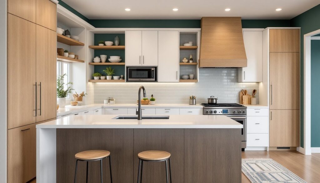 - Sustainable materials like recycled glass countertops, FSC-certified wood cabinets, and large-format porcelain tiles are now baseline expectations, reflecting durability, low maintenance, and eco-conscious choices in today’s kitchen remodel trends.